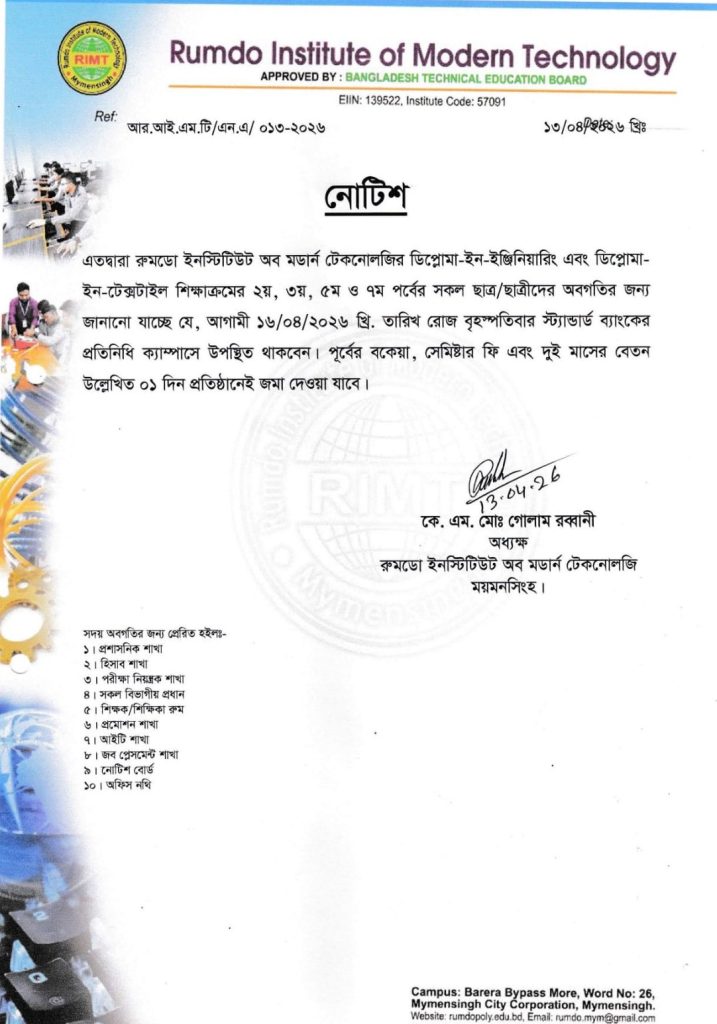 আগামী ১৬-০৪-২০২৬ তারিখে ব্যাংকের প্রতিনিধি কলেজে উপস্থিত থাকবেন।